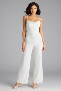 Elevate your vibe the instant you slip on this gorgeous jumpsuit as the stunning bride-to-be, birthday girl, or graduate! Made from an airy mesh fabric adorned with faux pearl embellishment for a glamorous style. This jumpsuit features a sweetheart neckline and adjustable straps for a perfect fit and a flattering wide-leg silhouette. Complete the look in block heels.