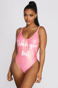 Thank you, next. Our new life motto. Wear it proud on this super cute pink monokini! It features a scoop neckline, spaghetti straps, an open back, and high cut bottom with a semi-cheeky fit.Model is 5'7" with a 34" bust, 24" waist and 36" hips. She is wearing a size small.