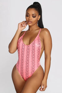 Get those juicy poolside details in this sexy snake print monokini! It comes in pink and features a scoop neckline, a low and exposed back, spaghetti straps, and high-cut bottoms with a semi-cheeky fit.Model is 5'7" with a 34" bust, 24" waist and 36" hips. She is wearing a size small.