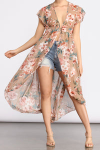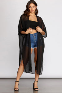 "I must be dreaming". Hit 'em with an entrance in this dreamy and romantic duster! A perfect layering piece over your bikini set, you can also work your charm by pairing it over a tube top and some denim cut-offs!