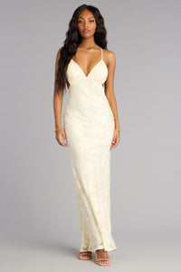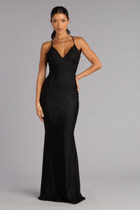 Made for the spotlight, the Enya formal dress drapes the body in floral mesh that catches every glance. With a plunge V-neck, lace-up open back, and floor-length hem, it blends modern romance with sculpted allure—perfect for those nights that deserve to be remembered.