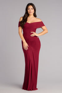 Effortless sophistication, redefined. The Evelyn formal dress moves with sleek confidence in soft, sculpting knit that hugs every curve. With its off-the-shoulder neckline and high front wrap slit, it’s made for the kind of entrance that lingers long after you’ve walked by.