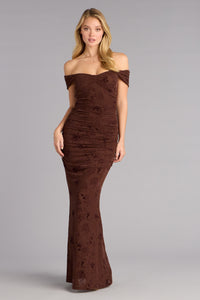 Sleek, sculpted, and designed for a take-your-breath-away entrance, the Kourt formal gown drapes the body in flocked velvet mesh for a look that feels both romantic and refined. The off-the-shoulder neckline, cutout back, and ruched mermaid floor-length hem create a softly dramatic silhouette perfect for the moments when you want all eyes on you—in the chicest way possible.