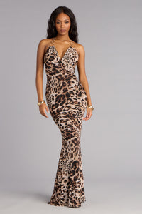 Crafted for the woman who embraces every entrance, the Jeanette formal dress shapes a striking mermaid floor-length silhouette in bold cheetah print. The halter v-neckline with hoop inserts, open back, and lower ruched seam adds sculpted allure—turning every step into a high-impact moment.