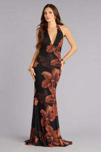 Romantic, sleek, and made for that double-take moment, the Leanna formal dress drapes in smooth knit floral print fabric with a softly curved neckline and a curve-hugging mermaid silhouette. The open lace-up back adds an irresistible touch of drama—perfect for evenings where you want to look effortlessly unforgettable.