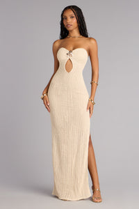 Designed for destination moments that call for understated allure, the Catrina crochet column dress feels both romantic and refined. A strapless sweetheart neckline meets a sculptural hardware cutout and high side slit, creating a silhouette that feels effortless, modern, and perfectly bridal for sun-soaked celebrations.