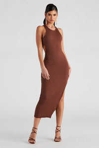 Make your mark in this stylish basic midi dress featuring a sleeveless crew neckline, wide shoulder straps that cross along the open back, and a form-hugging fit with a side slit detail. Complete the look in pointed-toe heels for a dinner with friends!