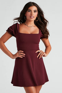 Get swept off your feet looking so sweet in this crepe skater dress featuring adorable short puff sleeves, a square neckline, a high waist seam, and a short length hem with a fit and flare silhouette. The crepe fabric offers a moderate stretch. Complete the look in a trendy ring set.