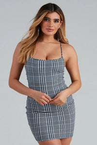 You'll be a total trendy stunner in this sultry sleeveless plaid mini dress! It features a square neckline, spaghetti straps, an open back with a strappy design, and a short, curve-hugging silhouette. Complete the look with chic mules.