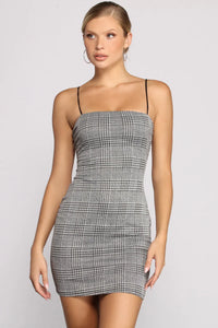 Get the perfect look for date night in this adorable plaid knit mini dress! It features a square neckline and a mini length, curve-hugging silhouette. Pair this chic dress with heeled booties and sleek hoop earrings.