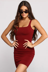 Throw on this basic mini dress and let the good vibes flow! This knit dress is perfect to dress up or dress down for your next date night or for GNO with the squad. The dress features a trendy square neckline, sleek bungee straps, and a mini-length silhouette. Dress up with mules or keep it casual in sneakers.