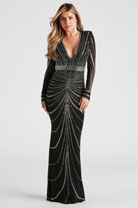 Make it an enchanting evening in the Jennie formal long dress sure to take everyone's breath away when you enter the room! She features long fitted sleeves with shoulder pads, a plunge V-neckline, and a form-hugging mermaid silhouette that kisses the floor in a long-length hem. The formal dress is designed with an intricate rhinestone embellished pattern on mesh fabric with a knit lining. Complete the look with fringe earrings for a holiday gala or charity ball!