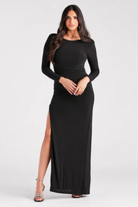 The Maddox formal long dress is a flattering option with a simple front and statement back! She features a classic boat neckline, fitted long sleeves with shoulder pads for a structured fit, a sultry asymmetrical open back design, and a side ruched seam atop a high slit to show some leg along her slim floor-length silhouette. The formal maxi dress is composed of a slinky and smooth knit fabric with a stretchy lining. Complete the look with a clutch and heels for a black tie celebration or gala.
