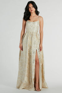 A stunning floral jacquard pattern with gold stitched trim emboldens the Hailee floor-length formal dress with timeless charm! Elevate your formalwear in this elegant dress featuring a classy square neckline and adjustable spagehtti straps for the perfect fit. The corset bodice, with flexible boning, creates a stunning A-line silhouette. Complete with hidden side pockets for your lip gloss or phone, a high front slit to show off your shoes, and a dramatic floor-length hem. Finish the look for a gala, ball, or fancy party with stud earrings, a bracelet, and spiral heels.