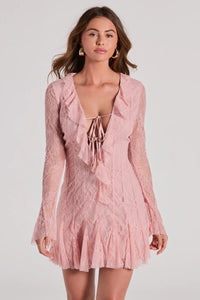 A dreamy mix of sophistication and sultry, this lace A-line mini dress is perfect for cocktail hour! Featuring sheer fitted sleeves with delicate ruffled cuffs, a plunging V-neckline adorned with femme ruffle trim and satin ties, and a flirty A-line silhouette with a playful ruffled hem. Complete the look in stiletto heels and a clutch!