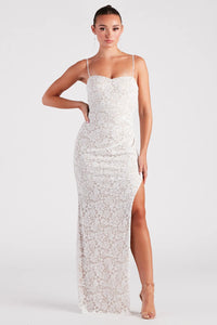 The prettiest lace shapes the Daphne formal maxi dress for an effortlessly boho-chic bridal or gala look! She features a sleeveless sweetheart neckline, a lightly padded bust, adjustable spaghetti straps, a lace-up back, and a curve-hugging slim silhouette with a sultry high front slit along her floor-length hem. The formal dress is composed of a delicate lace fabric with a stretchy knit lining. Complete the look with dainty earrings and a ring set.