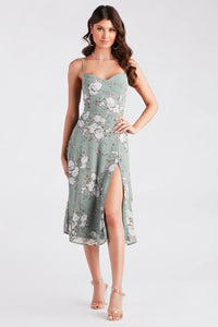 Enchanting and chic, this floral chiffon midi dress is perfect for a garden wedding. It features a sleeveless sweetheart neckline with a bust outline, adjustable spaghetti straps, a high waist seam, a smocked back panel with a zipper closure, a midi-length hem with a high front slit, and a flowy A-line silhouette. The airy chiffon fabric features a romantic blooming floral print alongside a dainty flower pattern. Style with clear block heels.