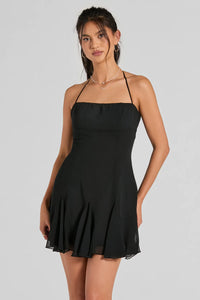 This chic pleated chiffon mini dress is perfect for date nights with your special someone! Designed with an airy sheer chiffon fabric with a full-length woven lining, this short dress will bring the flirtatious flair. It features a sleeveless square neckline, halter spaghetti straps with a tie-back design, and a partially open back with a secure zipper closure. The high waist flows out to a pleated A-line silhouette for an effortlessly pretty feel. Complete your look with strappy mules.