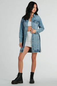 You'll be crushing the fashion scene in this denim trench! This jacket features long sleeves with button closures, a trendy collar neckline, and a flattering tie waist belt. With four pockets and a button-down front, you'll be both stylish and practical. Complete the look in booties.