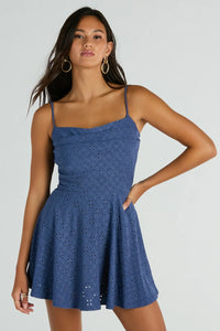 Enter your sweet era with this eyelet lace romper for the ultimate romantic aura at brunch, birthdays, or showers! The flowy and breezy sleeveless rompers feature a flattering cowl neckline with spaghetti straps and an adorable fit and flare silhouette for all-day twirls. Complete the look in wedges.