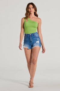 Create the cutest summer 'fits with this classic pair of destructed cut-off denim shorts! Detailed with trendy distressed detailing on the medium-wash denim fabric, these jean shorts are the perfect casual staple. They feature a flattering high-rise waist, a fitted cut-off hem, a traditional five-pocket and belt loop design, and a secure front button and hidden zipper closure. Style with a crop top and strappy sandals.