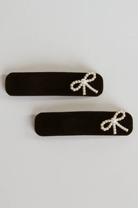 Add a luxe charm to your fave 'fits with this pearl bow velvet hair barrette set! It features two hair barrettes in a classic rectangular shape with a smooth velvet front material, dainty bow accents with mini faux pearl embellishments, and a metal snap clip to secure. Style with rhinestone stud earrings.