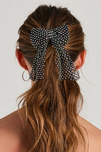 Add a glam pop to your girl's night out look with this fab rhinestone hair bow barrette! Made with a sheer fishnet material sparkling with iridescent rhinestone embellishments, it features a large bow design with a metal barrette closure for a secure fit. Style with a little black dress and platform heels.