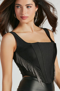 Get in the groove in this corset top made for every dance floor at parties or festivals! Features a sleek square neckline and flexible boning for a flattering and snatched fit. The dual chain fringe sides add a unique and eye-catching touch, while the cropped hem allows for easy styling and pairing with high-waisted bottoms.