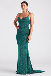 Embellished with light-catching glitter, the Tamora formal dress is destined to glow at school dances and awards banquets! She features a stunning sleeveless sweetheart plunge cowl neckline, a padded bust, adjustable spaghetti straps, and side ruching to accentuate your figure along her mermaid silhouette with a floor-length hem. The formal dress is composed of glitter knit fabric with a knit lining and plenty of stretch. Complete the look with dainty rhinestone earrings and a clutch.