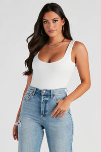 This staple bodysuit is a must-have in every fashionista's closet! The sleeveless bodysuit features front and back scoop necklines, wide shoulder straps, and a thong-cut bottom with a snap button closure. The bodysuit is composed of a double-lined stretchy knit fabric. Complete the look in high-rise jeans and mules.
