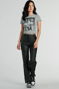 Show off your love for NYC in this trendy cropped graphic tee! Made with a cotton-blend fabric with a moderate stretch, it features a black-and-white cityscape graphic with the script "NEW YRK CTY." The top is shaped with a crew neckline, short sleeves, and a fitted cropped hem. Style with faux leather pants for an effortlessly edgy look.