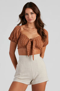 Embrace sun-soaked days in the most perfect crop top! Featuring puff sleeves, a sweetheart neck with a tie-front and keyhole cutout, smocked back panel, crafted from gauze woven-lined fabric. Complete the look in denim shorts for strolling the pier.