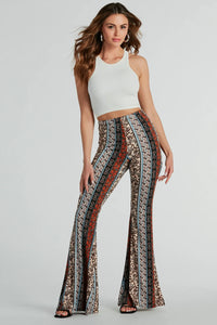 You'll be a wanderlust beauty in these paisley print flare pants, perf for creating a dreamy desert festival look! The soft and stretchy brushed knit fabric features a bohemian-inspired paisley print pattern for those effortlessly cool vibes. The high waist has an elastic band for comfortable wear. The hip-hugging fit continues through the leg, leading to a trendy flared hem. Style with a crop top and ankle booties.