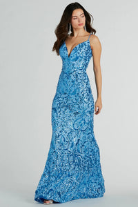 Gorgeous sequins make a statement on the Kara long formal dress perfect for prom, banquets, and birthday celebrations! Adorned with a captivating sequin scroll pattern, this formal gown is made of stretchy mesh fabric with a knit lining for comfortable elegance. She features a sleeveless wired V-neckline and padded bra cups for a flawless silhouette. The adjustable spaghetti straps provide a perfect fit, while the mermaid silhouette and floor-length hem create a striking look. Complete the look with a stunning necklace and earrings set to radiate luxe all evening!
