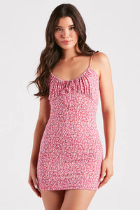 You're sure to have a natural attraction to this ditsy floral mini dress - perfect for a casual birthday or afternoon tea! It features a sleeveless scoop neck, spaghetti straps, a flirty tie front, and ruched bust, and a bodycon silhouette. Style with lace-up heels for a statement finish!