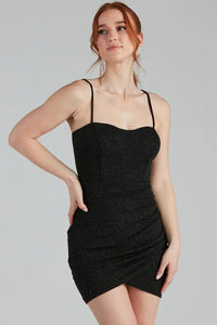 Let yourself glitz and gleam in this glitter mini dress for party season! It features a sleeveless sweetheart neckline with a built-in padded bust, spaghetti straps, and a curve-defining asymmetrical mini-length hem with a faux wrap silhouette. Complete the look in strappy heels.