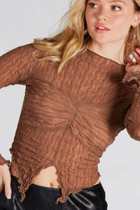 Look effortlessly chic in this mock neck crop top. Crafted from a textured sheer knit fabric, this top features a mock neckline, center front ruched seam and slit, and long sleeves with flare cuffs for an elevated look. Style with high-rise pants for grabbing dinner and drinks!