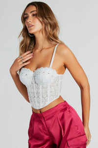Indulge in luxurious elegance in this stunning lace bustier made for your next night out! The sweetheart neckline with intricate beading adds a touch of sparkle, while the detachable and adjustable spaghetti straps provide versatile wear. With built-in padded underwire bra cups and flexible boning, this bustier offers support and shape. The sheer bodice and lace embroidery add a femme look with sleek satin cargo pants, mules, and simple earrings for an elevated style!