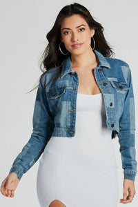 Layer on this retro-fab denim jacket for springtime fun! Showcasing a 60s-inspired patchwork design, this jacket offers a modern crop silhouette, slouchy long sleeves with button cuffs, a classic collar neckline, faux flap pockets, and button-down front closures for multiple styling options. Complete the look in a denim midi skirt to rock a denim-on-denim outfit!