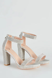 Step out and shine in these rhinestone block heels featuring a glitter mesh almond-shaped toe, a wide toe and ankle strap, and a back zipper closure. Complete the look in these rhinestone heels with a stunning necklace and earring set.