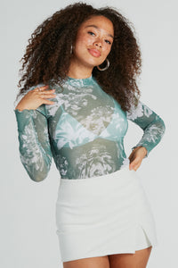 Look fresh in this floral mesh crop top perfect for brunch and spring parties! This top boasts a chic mock neckline, fitted long sleeves, and a cropped hem that flatters your figure on sheer mesh fabric with a trendy floral print. Style with a mini skort and mules to complete the look!