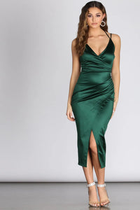 Drape yourself in our luxe Amanda satin midi dress! She features a spaghetti strap and halter design on the surplice V-neckline that shapes the fitted bodice. Her bodycon silhouette smooths and wraps around your curves and hits mid-calf with a sexy slit accent. The dress is composed of silky satin fabric with a moderate stretch. Complete the look in this midi-length dress with gold hoops.