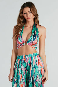 Color you pretty in this satin crop top to brighten up this new season! It features a sleeveless plunge halter neckline, a center hardware insert, and an ultra-cropped hem on smooth satin with an abstract print. Complete the look with the matching bottoms for a vacation!