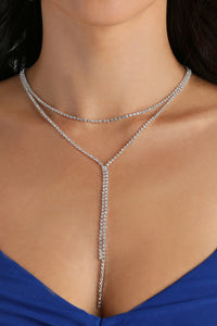 Adorn your neck with this glam layered lariat necklace for homecoming or a black tie soiree! The necklace features a double-layered design with rhinestone embellishments leading to a lariat-style fringe. Includes a back adjustable chain with a lobster clasp closure. Complete the look with earrings.