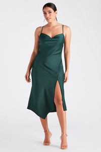 You have plans and the Annabella formal satin midi dress is the style you need for looking sultry-chic at upcoming soirees! She features a classy sleeveless cowl neckline, adjustable spaghetti straps, and a slim and flattering A-line silhouette with a front curved seam atop her flirty slit midi-length hem. The formal dress is composed of a matte woven satin-lined fabric with a subtle sheen effect. Complete your breathtaking look in faux pearl duster earrings and block heels.