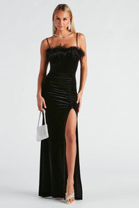 Bring the dramatic flair to your next formal soiree in the stunning Jaime feather trim velvet mermaid dress. She features a sleeveless square neckline with a chic marabou feather trim, spaghetti straps, a high waist seam, ruching down the side leading to a thigh-high slit, and a fitted, floor-length, mermaid silhouette. The luxe velvet fabric offers a moderate stretch. Style this dress with a glitzy evening bag.