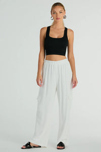 Stroll in these linen wide-leg pants during golden hour on vacation or a weekend by the beach! Designed with a high-rise elasticized waistband and linen fabric, these pants are perfect for all-day wear along with convenient cargo flap pockets and a wide-leg silhouette, you'll feel effortlessly chic and ready for anything. Complete the look with the matching vest and sandals.
