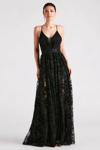 Beautifully bold and stunning! The Kimberly formal dress will capture every heart at galas and black tie functions! She stuns in a sleeveless V-neckline with a sheer mesh insert, a padded and pleated bust, adjustable spaghetti straps that cross along the open back, and an empire waist that leads to her flattering A-line silhouette with a floor-length hem. The formal dress is composed of a flocked velvet pattern mesh fabric with a stretchy knit lining and dual front slits. Complete the look with dangly rhinestone earrings.