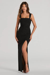 Make the most remarkable entrance in the Annie glitter formal dress at galas or weddings! With its square neckline, wide shoulder straps, and stunning tie-back detail, this dress exudes sophistication. The high front wrap slit and mermaid silhouette add glamour, while the floor-length hem and glitter knit fabric ensure you make a statement at any formal occasion. Complete the look with a clutch and earrings.