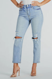 Love your look in these must-have denim jeans that make the perfect base for creating stylish day or night outfits! Made from a rigid non-stretch denim fabric with a cool color fading, these jeans boast a flattering high-rise waist and straight-leg silhouette with trendy distressed accents for an edgy touch. Complete the look with a chic lace bodysuit, crop jacket, and mules for a stunning allure!